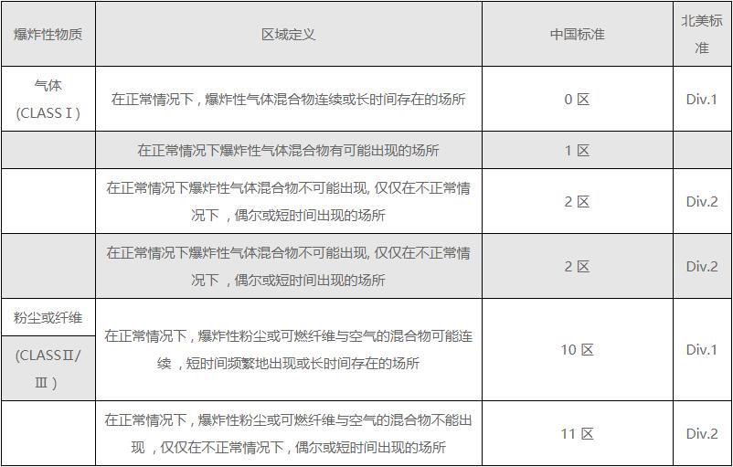 1) 在爆炸性氣體區(qū)域環(huán)境(0區(qū)、1區(qū)、2區(qū))不同電器設(shè)備應(yīng)用安全級別的區(qū)劃。如旋轉(zhuǎn)電機選型分成隔爆型(編號d)、正壓型(p)、增安型(e)、無火花型(n)