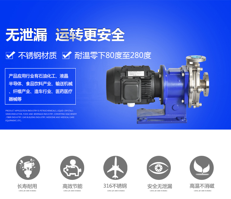 在石油、化工、制藥、電子等眾多領(lǐng)域,越來(lái)越多的廠家,對(duì)其輸送的介質(zhì)都要求無(wú)泄漏的泵型,不銹鋼磁力泵的過(guò)流部件采用不銹鋼(304、316、316L)制成,廣泛應(yīng)用于石油、化工、制藥、電鍍、環(huán)保、水處理、國(guó)防等部門(mén),是輸送易燃、易爆、有毒和貴重液體的理想設(shè)備。適用溫度:-40℃~280℃。